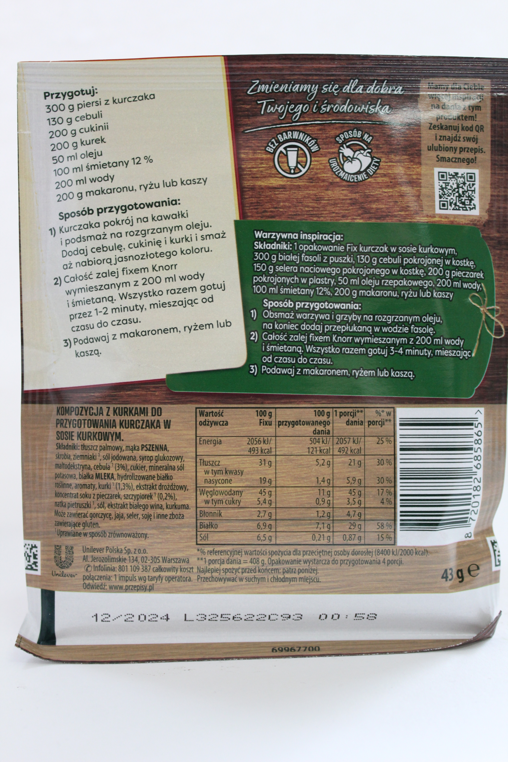 Skład: tłuszcz palmowy, skrobia, ziemniaki*, mąka pszenna, sól jodowana, syrop glukozowy, maltodekstryna, cebula* 3%, cukier, mineralna sól potasowa, hydrolizowane białko roślinne, białka mleka, aromaty, kurki* 1,3%, ekstrakt drożdżowy, koncentrat soku z pieczarek*, szczypiorek* 0,2%, natka pietruszki*, sól, ekstrakt białego wina, kurkuma. *składniki uprawiane w sposób zrównoważony.Produkt może zawierać: gorczyca, jaja, soja, seler, inne zboża zawierające gluten[:nl]