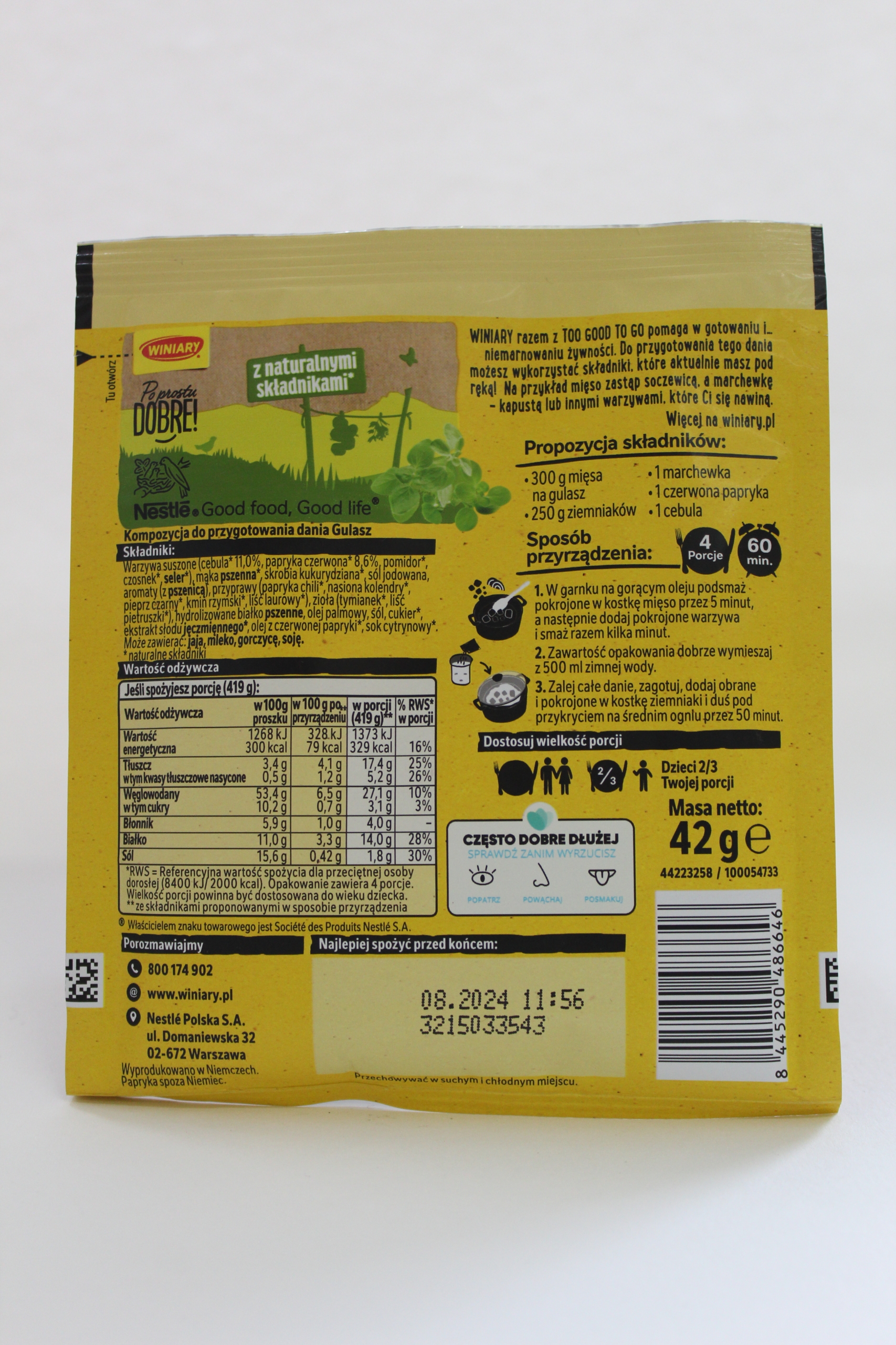 Skład: warzywa suszone (cebula* 11,0%, papryka czerwona* 8,6%, pomidor*, czosnek*, seler*), mąka pszenna*, skrobia kukurydziana*, sól jodowana, aromaty (z pszenicą), przyprawy (papryka chili*, nasiona kolendry*, pieprz czarny*, kmin rzymski*, liść laurowy*), zioła (tymianek*, liść pietruszki*), hydrolizowane białko pszenne, olej palmowy, sól, cukier*, ekstrakt słodu jęczmiennego*, olej z czerwonej papryki*, sok cytrynowy*.